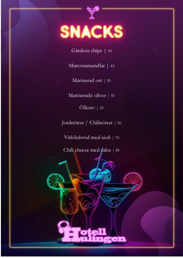 - Dricka och Snacks: Beställ din favoritdrink eller en läcker snacksskål från vår bar. Det är den perfekta kombinationen för en oförglömlig kväll.